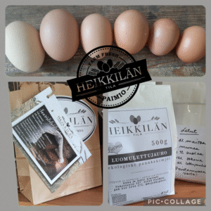 Jalostamme itseviljeltyä luomuviljaa erilaisiksi myllytuotteiksi. Lisäksi tuotamme hunajaa sekä kananmunia. Kanalamme on pieni, kanoilla on paljon tilaa, myös ulkotarha. Ne syövät osittain luomuviljaa sekä kalajauhotonta rehutiivistettä. Tilalla palvelee tilapuoti.